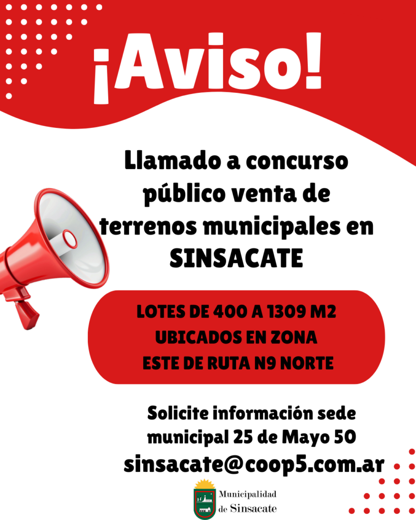 La Municipalidad de Sinsacate informa a la comunidad que, mediante el Decreto Nº 2273/2025, dictado en el marco de la Ordenanza Nº 1386/2025, se ha dispuesto el llamado a Concurso Público de Precios para la venta de siete (7) lotes de propiedad municipal, ubicados en el fraccionamiento identificado como Lote 35, Manzana 02.